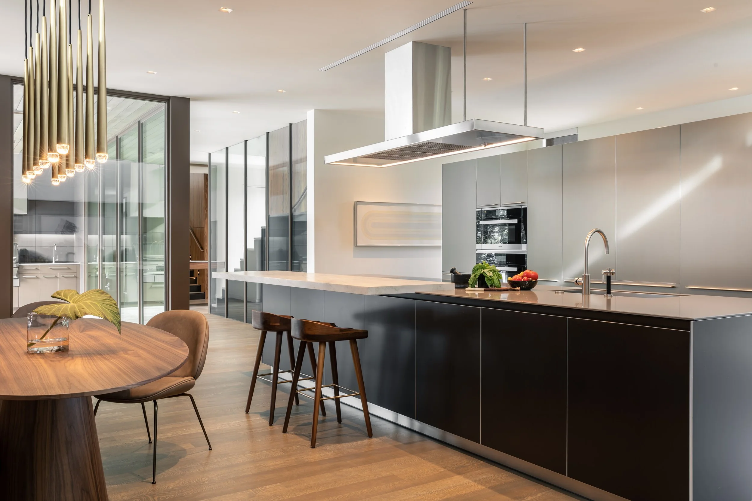 At over 8,000 square feet, this new-construction residence is both dramatic and deeply livable, blending organic warmth with glamorous detail. From the moment you arrive, a ten-foot walnut pivot door with custom brass hardware announces the balance of artistry and craft found throughout. Inside, the sunken living room glows with three sculptural blown-crystal fixtures, their warm light washing across silver travertine floors. A custom double-sided sectional anchors the space, while soaring retractable glass doors dissolve boundaries between indoors and the lush pool, veranda, and gardens beyond. This project is celebrated nationally and locally - earning the Luxe RED Award for Interior Architecture and Design and recognition as a 5280 Home Top Denver Design.